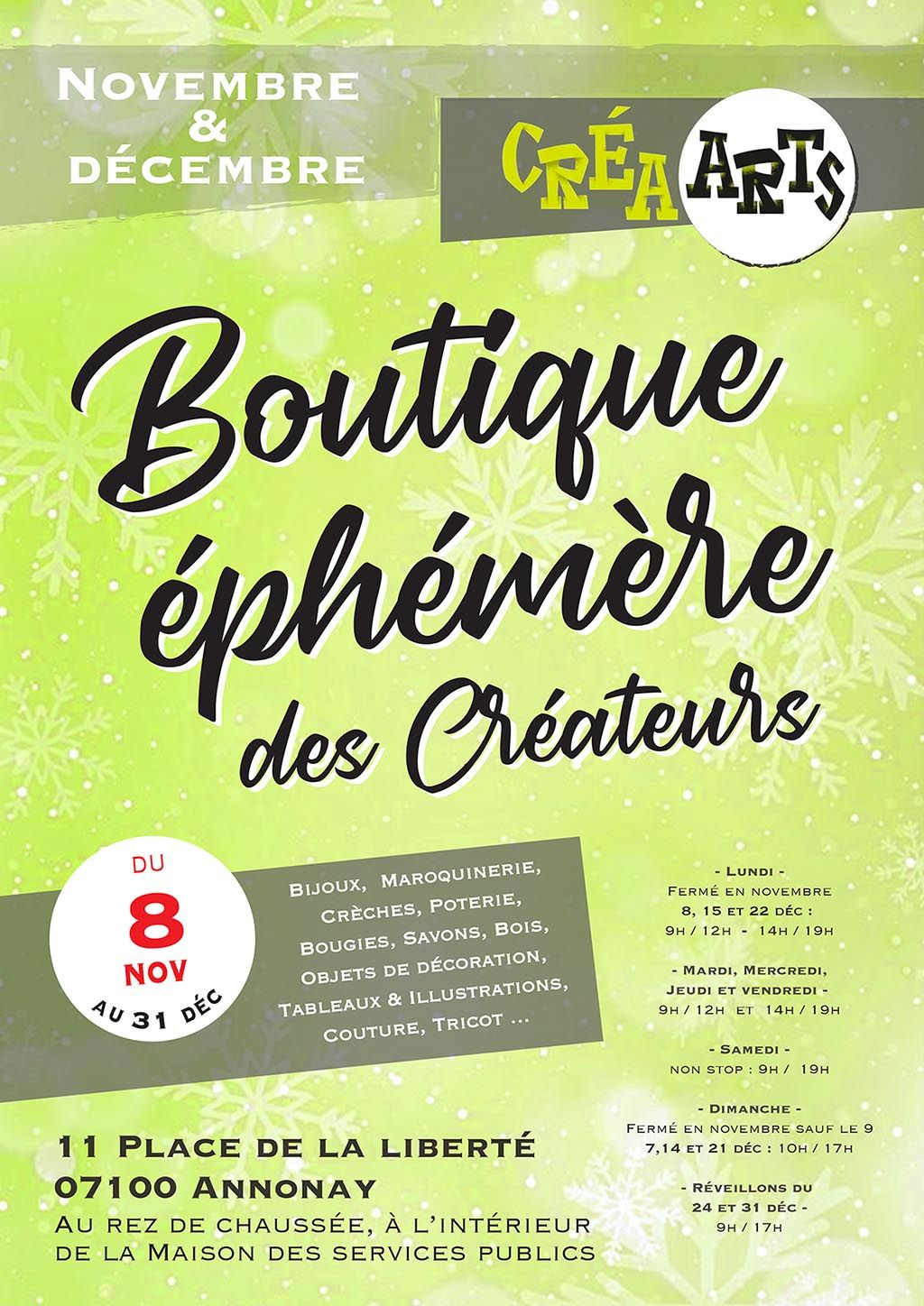 Cette année, la boutique éphémère ouvre ses portes au Rez-de-chaussée de la MSP (Maison des Services Publics – Place de la Liberté à Annonay), du 8 novembre au 31 décembre.