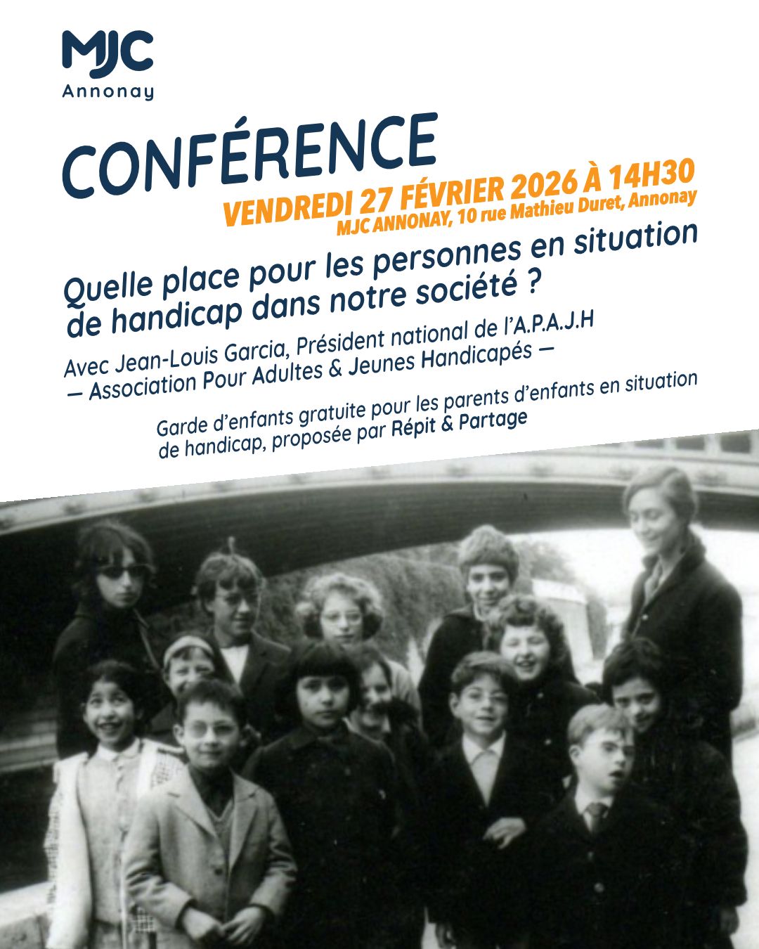 À NOTER : Dans le cadre de la conférence proposée par la MJC d'Annonay, Répit et Partage met en place une halte répit pour permettre aux parents et accompagnants d'assister à la conférence en toute sérénité. Les enfants et jeunes adultes en situation de handicap peuvent être confiés à la garde Halte Répit le temps de la conférence, et ce, gratuitement. Encadrement par des professionnels assuré.