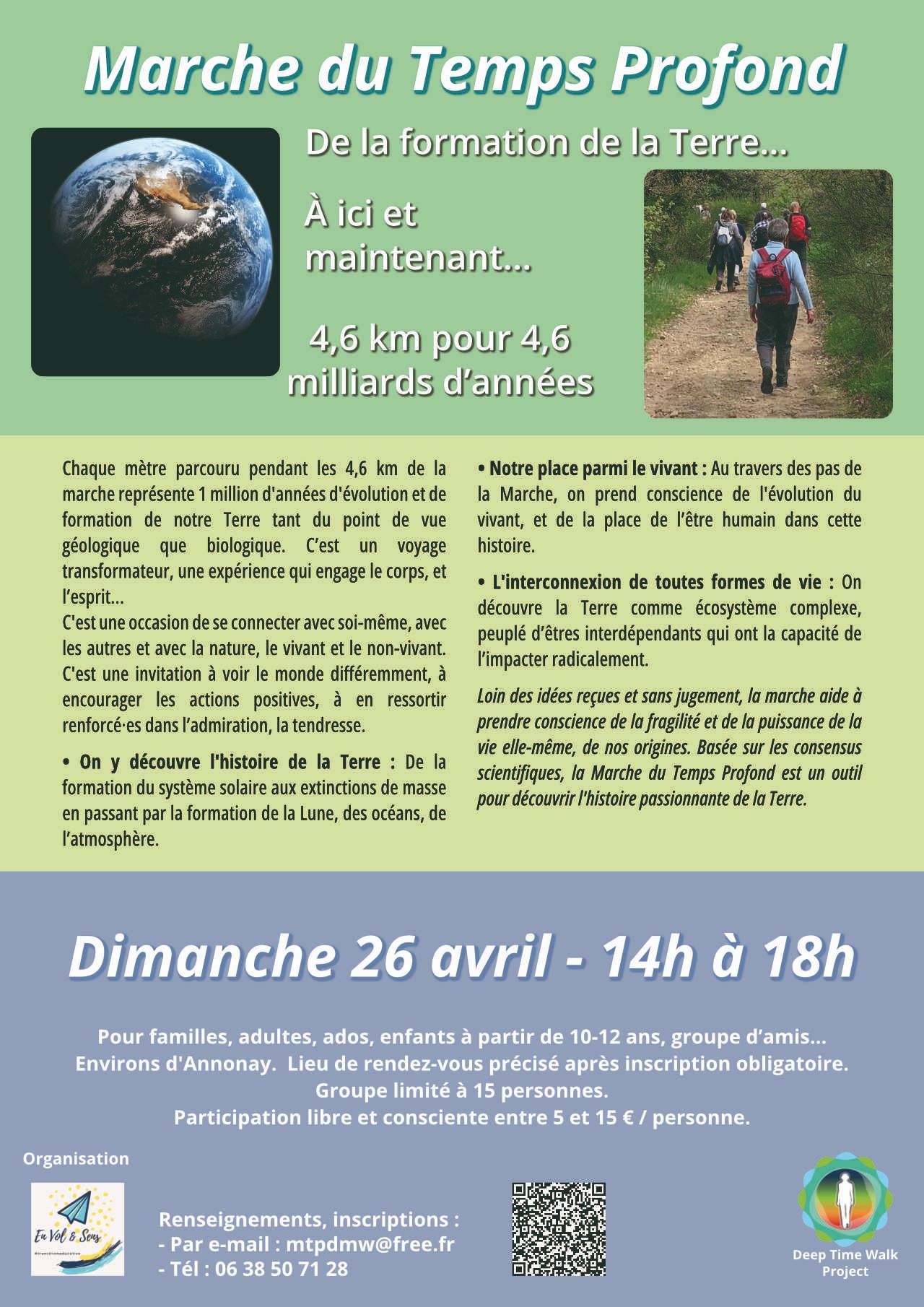 Une Marche du Temps Profond est bien plus qu’une simple randonnée, c’est une promenade guidée, contée de 4,6 km pour traverser les 4,6 milliards d'années d'évolutions de notre Terre, avec des points d'arrêt sur les moments clés de son histoire et de celle de la vie. Chaque mètre parcouru représente 1 million d'années d'évolution et de formation de notre Terre tant du point de vue géologique que biologique. C’est un voyage transformateur, une expérience qui engage le corps, et l’esprit…