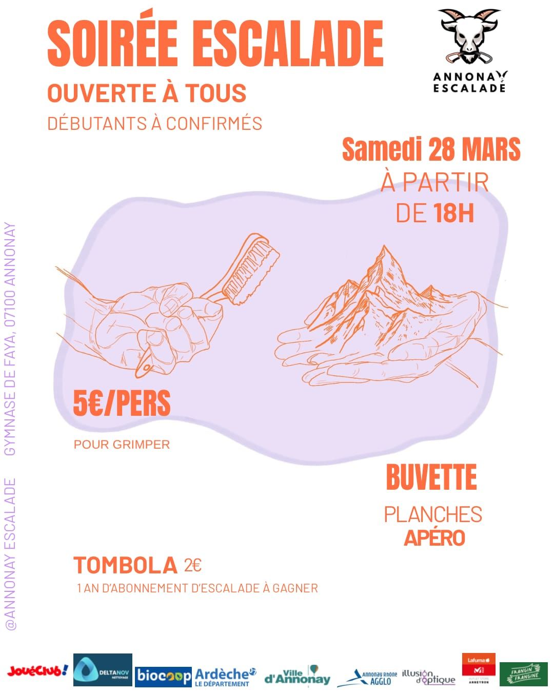 Sport Le 28 mars 2026 à 18:00 Gymnase rives de Faya, 48 avenue Jean Jaurès07100 Annonay 5 € pour grimper, accès libre à la buvette 06 06 40 27 71